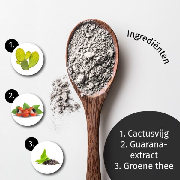 Formule met vijf werkzame stoffen: cactusvijg, guarana-extract, groene thee-extract, psylliumschil en inuline.