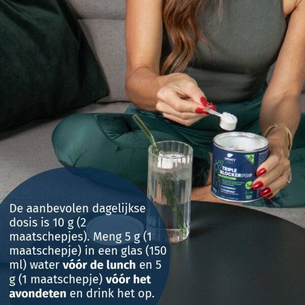 De aanbevolen dagelijkse dosis is 10 g (2 maatschepjes). Meng 5 g (1 maatschepje) in een glas (150 ml) water vóór de lunch en 5 g (1 maatschepje) vóór het avondeten en drink het op.