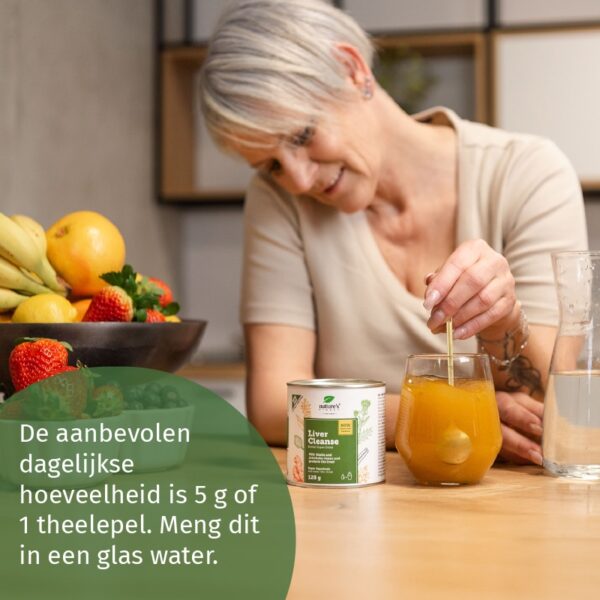 De aanbevolen dagelijkse hoeveelheid is 5 g of 1 theelepel. Meng dit in een glas water.