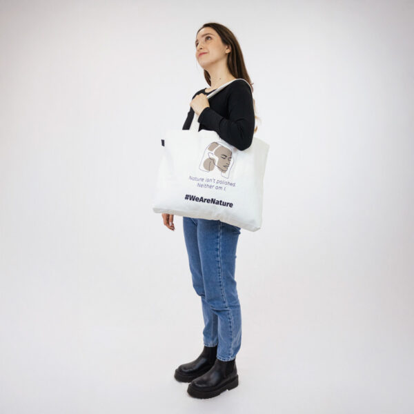 Ruim, veelzijdig en duurzaam, deze tas is ideaal om je essentials mee te nemen en tegelijk je waarden en liefde voor de natuur uit te dragen.