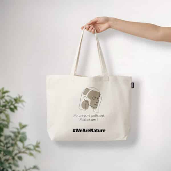 Een tijdloze draagtas ontworpen voor moeiteloze stijl en dagelijks gebruik. Bedrukt met de doordachte boodschap “Nature isn’t polished. Neither am I.” naast een minimalistische lijntekening van een sereen gezicht, viert deze tas authenticiteit en het omarmen van natuurlijke schoonheid.