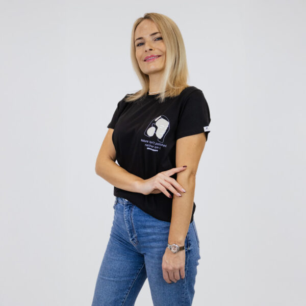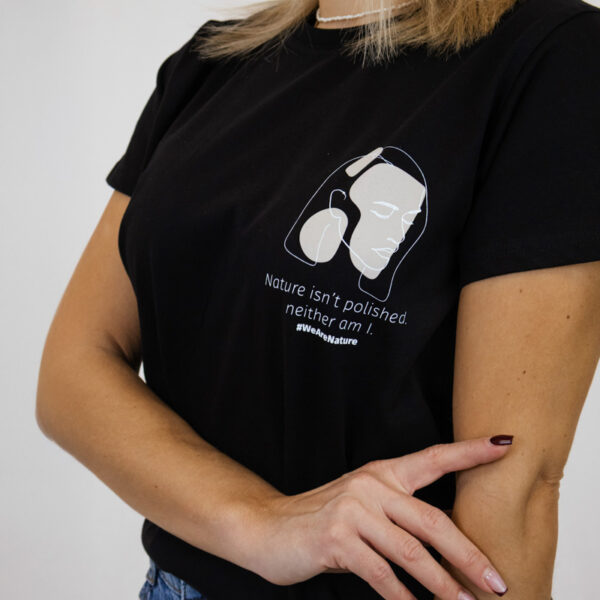 Een minimalistisch zwart T-shirt ontworpen met een subtiele impact. Met een kleine, verfijnde graphic en de boodschap “Nature isn’t polished, neither am I.” op de borst, viert het authenticiteit en natuurlijke schoonheid. Clean, ingetogen en moeiteloos draagbaar, perfect voor alledaagse styling terwijl het een stille maar krachtige boodschap uitdraagt.
