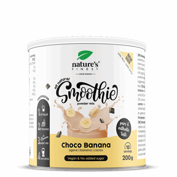 Neem gewoon een glas, vul het met water of plantaardige melk, voeg je favoriete smoothiemix (2 eetlepels) en een halve banaan toe, mix het in een blender en geniet!