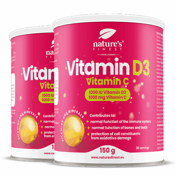Met vitamine D3 en Vitamine C poeder zorgen we voor de beste absorptie, die onmiddellijk na de inname begint. De primaire rol van vitamine D is het handhaven van homeostase en een constant niveau van calcium en fosfaten in het bloedplasma, terwijl Vitamine C als een krachtige antioxidant functioneert.